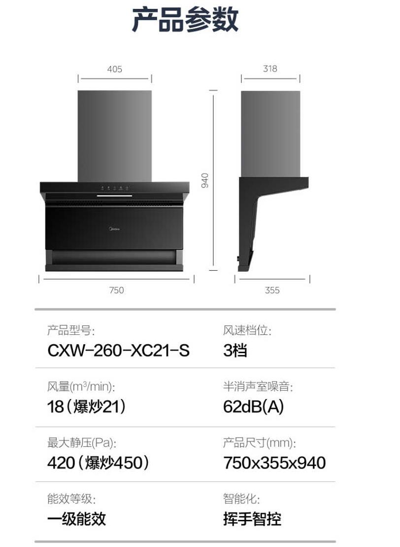 当前位置:首页 > 建材布草、厨房设备-厨房配件 > 美的 CXW-260-XC21-S顶侧双吸式吸油烟机 21m3/min风量 750mm小尺寸 挥手控制 450Pa爆炒静压