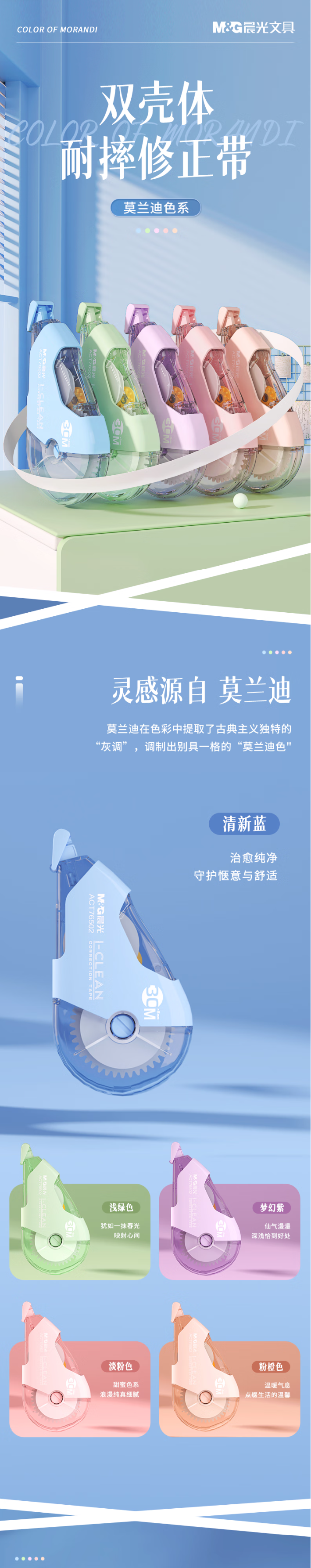 当前位置:首页 > 办公及体育用品-橡皮 > 晨光文具150M大容量双壳加厚耐摔修正带 30M*5MM学生涂改带隐形改正带 莫兰迪色系5支装