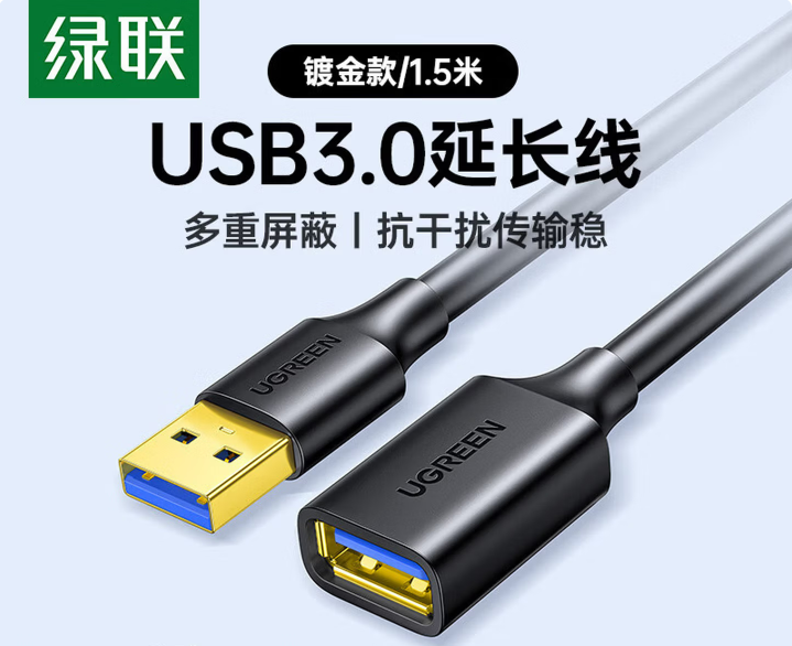 绿联USB3.0延长线公对母数据连接线电视电脑主机硬盘U盘鼠标键盘打印机扩展线加长转接线1.5米 30126